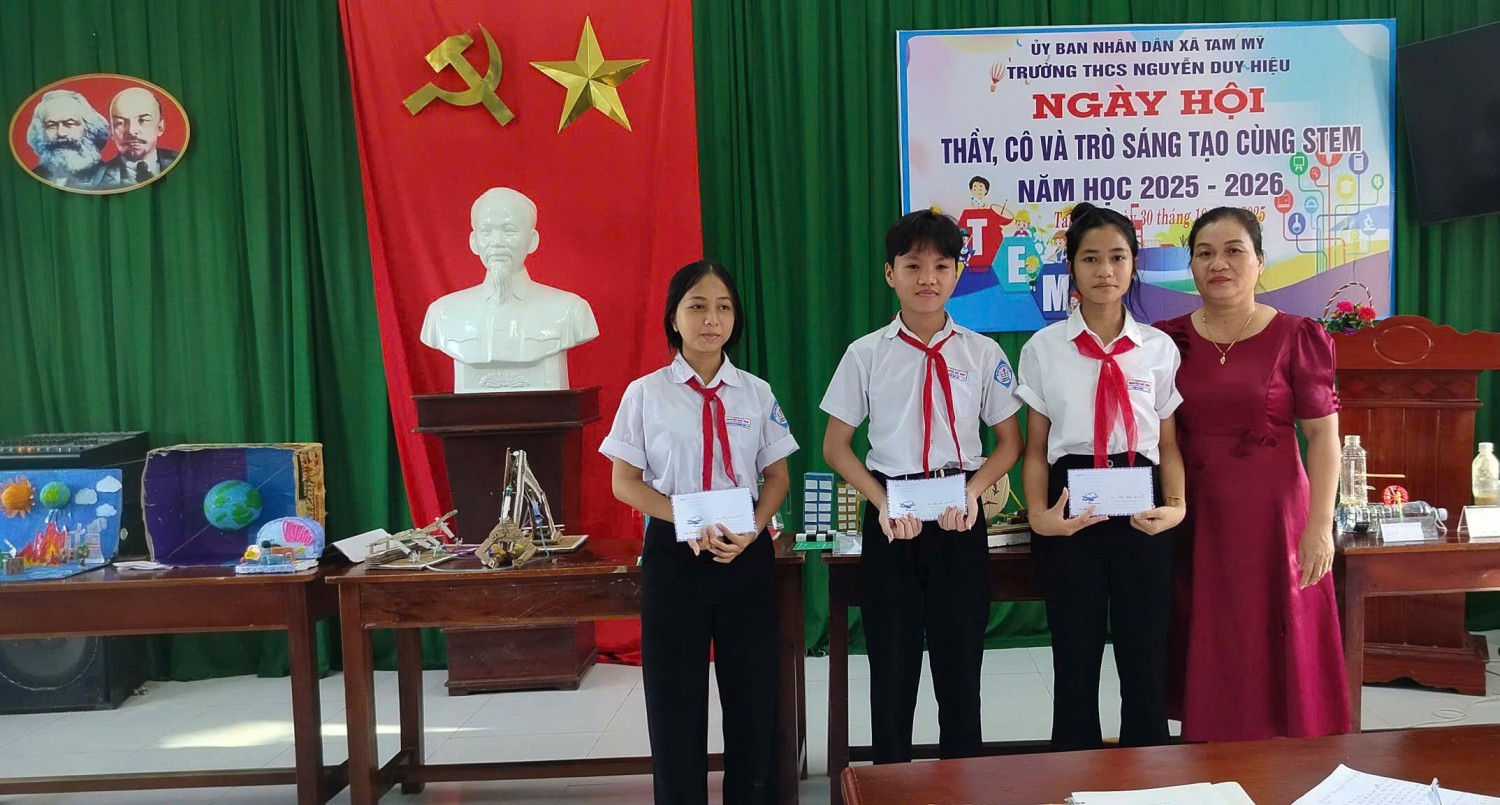 - Hai giải Nhì: + Lớp 8/2 với mô hình “Mối quan hệ giữa thiên nhiên và con người”, thể hiện thông điệp sâu sắc về bảo vệ môi trường và phát triển bền vững. + Lớp 8/1 với mô hình “Máy phát điện chạy bằng tay”, mang tính ứng dụng cao và gắn liền với thực tế đời sống. - Hai giải Ba: + Lớp 9/1 với mô hình “Nguồn sáng xanh cho đời sống”, góp phần định hướng ý thức sử dụng năng lượng tái tạo. + Lớp 9/2 với mô hình “Máy lọc nước mini”, thể hiện khả năng vận dụng kiến thức khoa học để giải quyết vấn đề môi trường. - Ba giải Khuyến khích: + Lớp 6/1 với mô hình “Bảo vệ môi trường”. + Lớp 6/2 với mô hình “Ngày và đêm luân phiên nhau”. + Lớp 7/2 với mô hình “Hồ cá mini” – thể hiện bàn tay khéo léo và óc sáng tạo của học sinh khối 7. Các sản phẩm đoạt giải đều mang đậm dấu ấn cá nhân và tinh thần hợp tác nhóm, thể hiện rõ sự đầu tư, nghiên cứu nghiêm túc của học sinh cũng như sự hướng dẫn tận tình của giáo viên bộ môn. Phát biểu tại Ngày hội, cô Trần Thị Kim Chung – Phó Hiệu trưởng nhà trường đã ghi nhận và biểu dương nỗ lực của tổ Tự nhiên cùng toàn thể học sinh tham dự. Cô khẳng định rằng hoạt động STEM không chỉ giúp học sinh củng cố kiến thức liên môn mà còn rèn luyện kỹ năng giải quyết vấn đề, tư duy sáng tạo và tinh thần làm việc nhóm – những phẩm chất quan trọng của công dân thời đại mới. Ngày hội STEM cấp trường năm học 2025 – 2026 khép lại trong không khí vui tươi, phấn khởi. Những ánh mắt rạng rỡ, những nụ cười hân hoan của học sinh là minh chứng cho thành công của hoạt động ý nghĩa này. Qua ngày hội, các em được khơi dậy niềm đam mê khám phá khoa học, hun đúc tình yêu học tập và hình thành ý thức vận dụng kiến thức vào đời sống. Hoạt động STEM không chỉ là sân chơi học thuật mà còn là cầu nối giúp học sinh gắn kết giữa lý thuyết và thực hành, giữa tri thức nhà trường và cuộc sống. Tin tưởng rằng, với tinh thần học hỏi, sáng tạo và sự quan tâm của Ban giám hiệu cùng đội ngũ giáo viên, phong trào STEM của trường THCS Nguyễn Duy Hiệu sẽ ngày càng phát triển mạnh mẽ, góp phần nâng cao chất lượng giáo dục toàn diện, đáp ứng yêu cầu đổi mới giáo dục trong giai đoạn hiện nay.